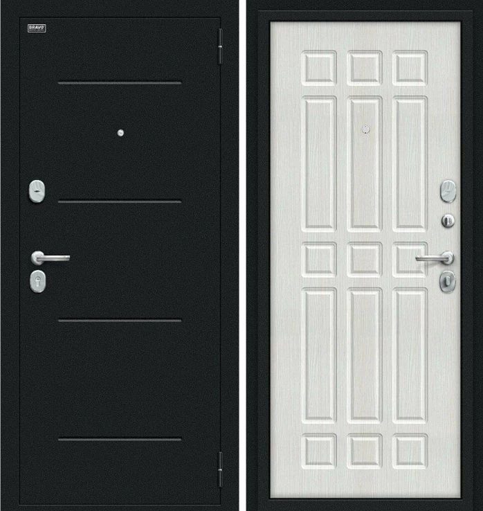 Надежная входная Дверь Браво Мило Букле черное/Bianco Veralinga премиум класса по цене 30 553 руб. Большая толщина стали защитит от проникновения в ваш дом, квартиру или коттедж. Используется очень качественная фурнитура: замки, цилиндры, ручки, защелки. Покрытие и отделка двери изготовлено под внимательным контролем производителя. Дверь имеет долгий срок службы и гарантию.